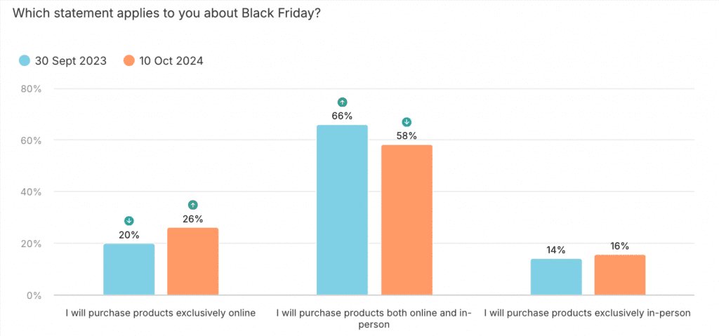 The high intent to use AI tools for Black Friday shopping is accompanied by an increased intent to purchase online. Of those who plan to shop on Black Friday, 26% say they will make purchases exclusively online, which is an increase of +6 percentage points compared with last year.