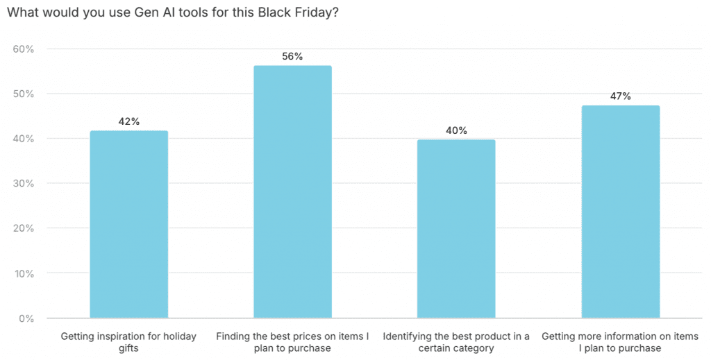 Price research is a key usage for AI during the November shopping holiday. More than 56% of AI users will leverage the technology to find the best prices. Nearly 5 in 10 consumers will also use it to get more information on the products they plan to purchase.