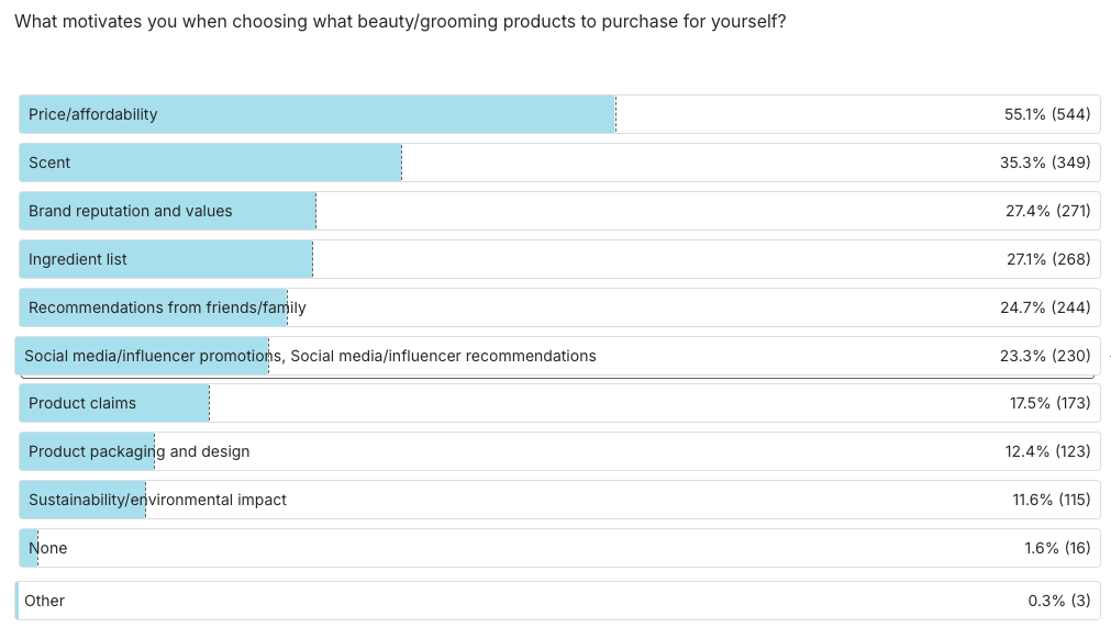 But it’s important to note that price isn’t the only consideration. After scent, brand reputation and product claims also carry weight, with 27.4% of respondents indicating that a brand’s values influence their decisions.
