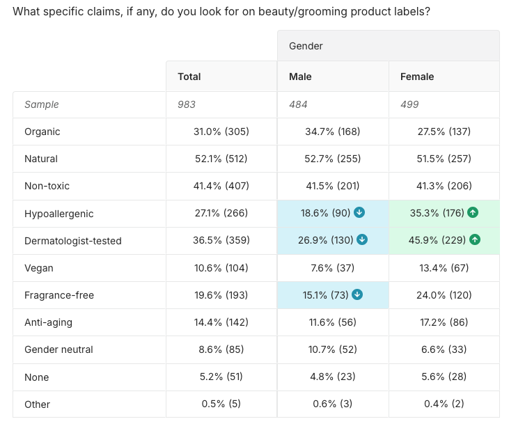 In fact, over 52.1% of respondents actively look for ‘natural’ claims on product labels, and 41.4% seek ‘non-toxic’ options. ‘Dermatologist-tested’ and ‘hypoallergenic’ resonate significantly with women – here we see 45.9% and 35.3% of females look for these claims, compared to 26.9% and 18.6% respectively.