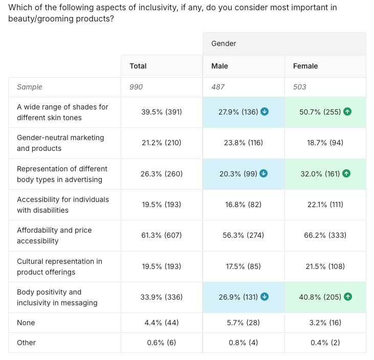 Gen Z places a strong emphasis on inclusivity in terms of representation and product diversity in beauty and grooming. Two fifths (39.5%) of respondents value a wide range of shades for different skin tones, highlighting the importance of racial and ethnic representation in product offerings. Body positivity and inclusive messaging also resonated with 1 in 3 (33.9%) of Gen Z. Perhaps unsurprisingly women were found to consider and prioritize these topics significantly more than men.