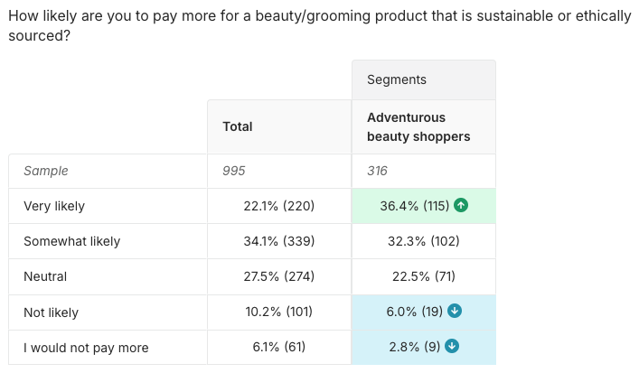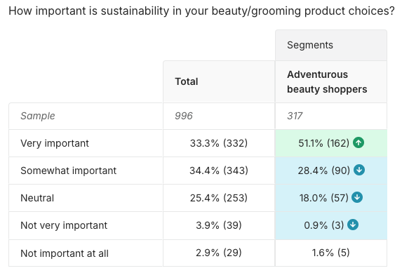 More than half (51.1%) of Adventurous Beauty Shoppers consider sustainability ‘very important’ in their beauty product choices. This is significantly higher than the total population (33.3%).