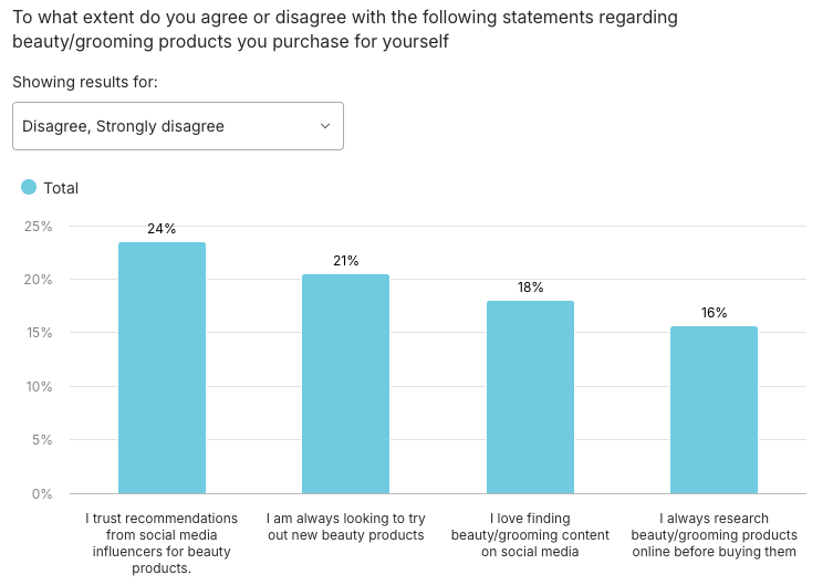 Despite their reliance on digital influencers, Gen Z is also cautious. Close to 1 in 4 (24%) do not trust recommendations from social media influencers. This suggests that while influencers are certainly a big part of the beauty industry, authenticity and transparency are crucial for earning and maintaining Gen Z’s trust.