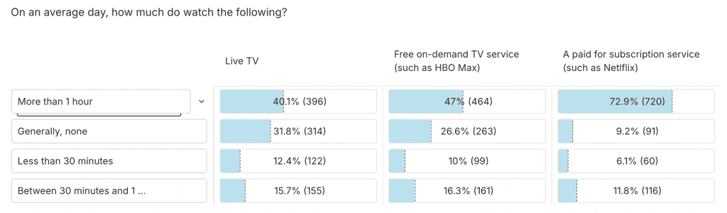This is evident when looking at what form of media they typically engage, with close to 1 in 3 saying they never watch linear tv or traditional TV and the majority (72.9%) spending more than an hour watching a paid for subscription service and streaming services (such as Netflix).