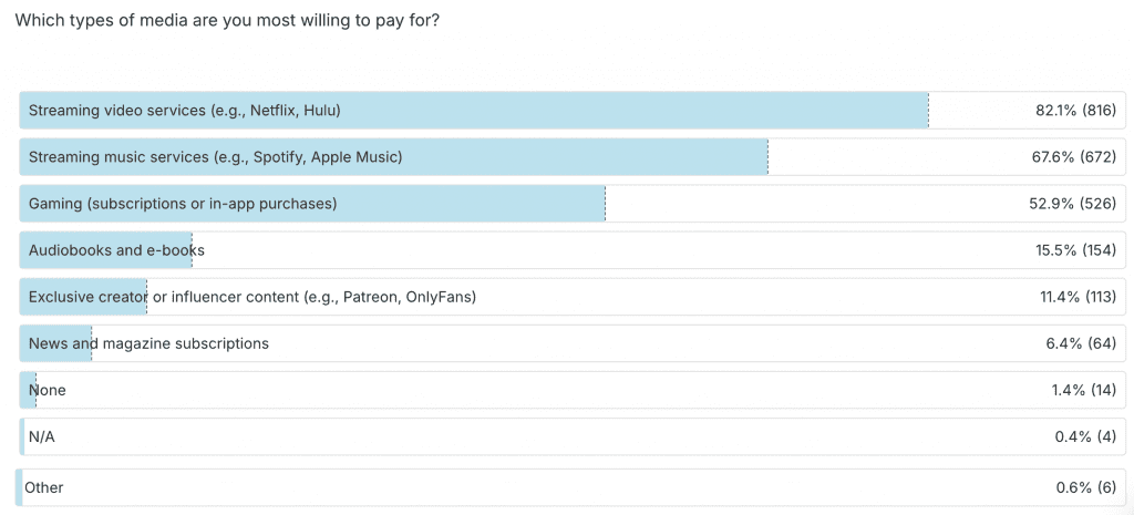 Streaming music services also capture significant interest, with 2 in 3 (67.6%) of Gen Z subscribers indicating a willingness to pay. However, less than 16% are interested in news, magazine subscriptions, or e-books, demonstrating that traditional and text-heavy media content holds limited appeal.