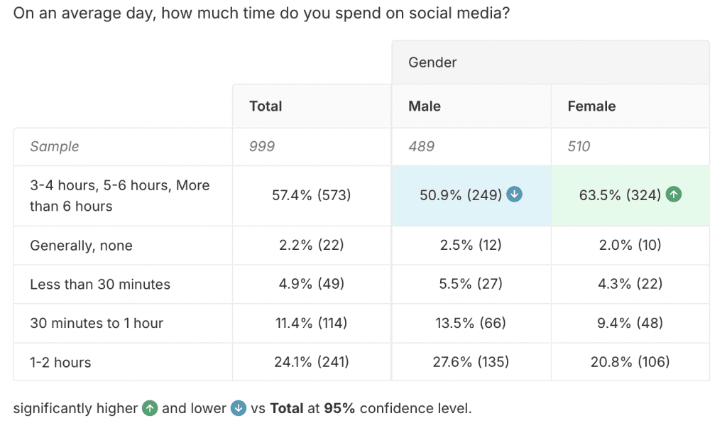 Over half of total respondents spend 3+ hours on social media per day, and we’ve found that females are statistically more likely to be in this super user cohort as compared to males.