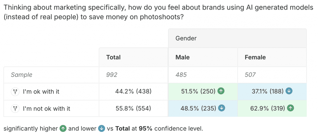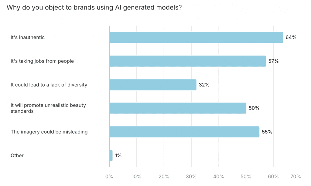 Over 55% of respondents are not okay with brands using AI generated models, with the top reasons being inauthenticity, the potential of being misleading, and the result of taking jobs from people. Women are significantly more likely to say that they are not okay with this practice.