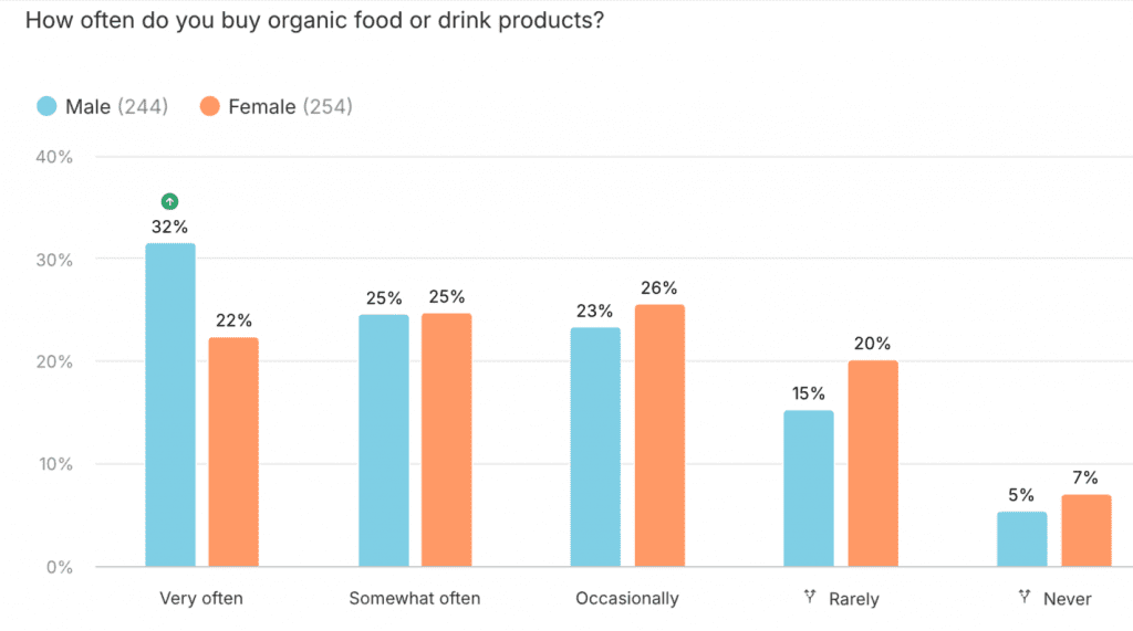 Male consumers are likely to buy organic food and drink products more often: 32% say they buy them ‘very often’, compared with 22% of females. They’re also more likely to be willing to pay ‘large’ premiums for organic products (15% versus 9% of women) and shop for organic food and drink in a variety of outlets.