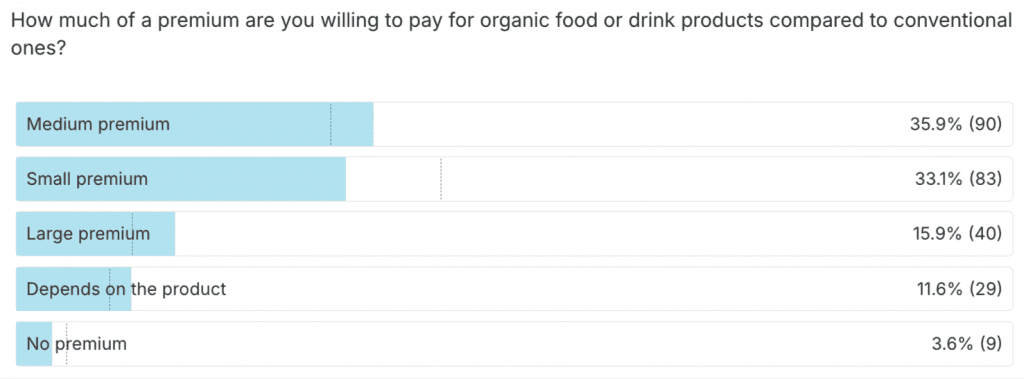 Despite this, they’re prevented from purchasing more organic products due to a lack of availability in stores (33% versus 26% of total sample), and a limited range where products are available (24% versus 16% of total). This segment is less likely than others to be put off by the price of organic food and drink (58% versus 68% overall). In fact, we see that 33% are willing to pay a medium premium, while 17% claim to accept paying a large premium.