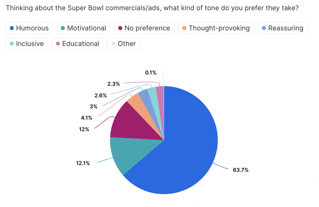 This escape from reality also extends to their expectations for this year’s Super Bowl commercials. The vast majority (63%) want ads to be humorous, far behind 12% wishing to see motivational messages and just 4% hoping for thought-provoking commercials.