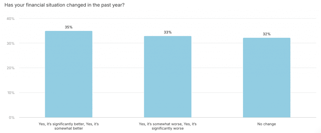 We see an almost even split of respondents who have had either a positive change, a negative change, or no change to their financial situation in the last year. This split seems to be a main driver on how that outlook is influencing spending.