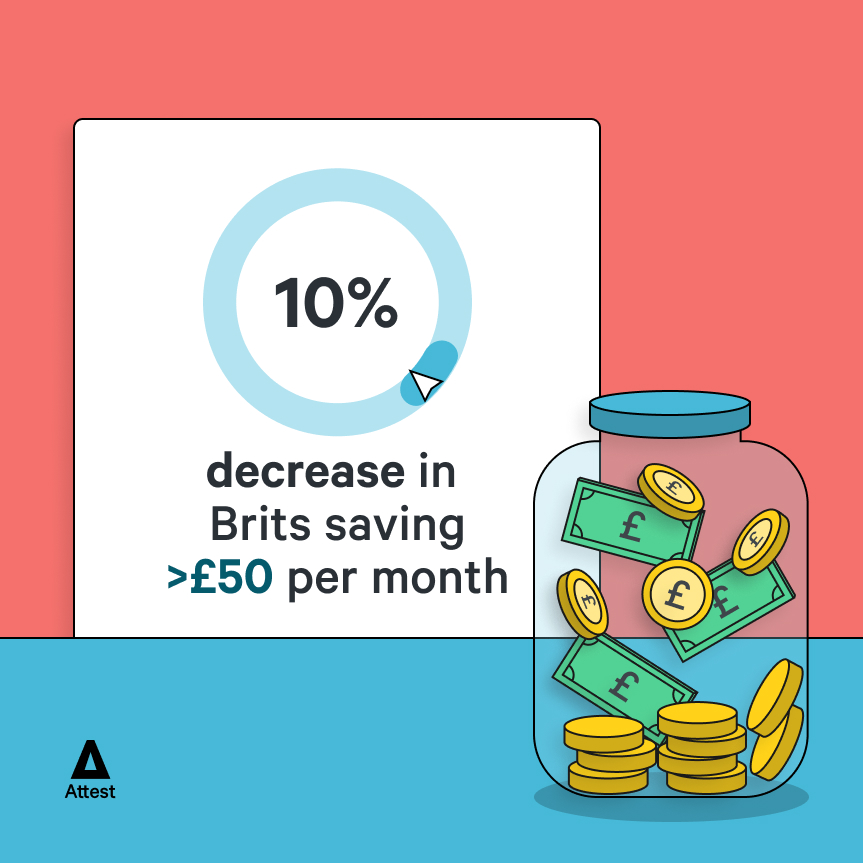 The percentage of people saving more than £50 each month has declined by -4.7 percentage points to 47.0%, while those saving £50 or less has increased +4.3 percentage points to 24.5%. Meanwhile, 21.8% of people are not saving at all.