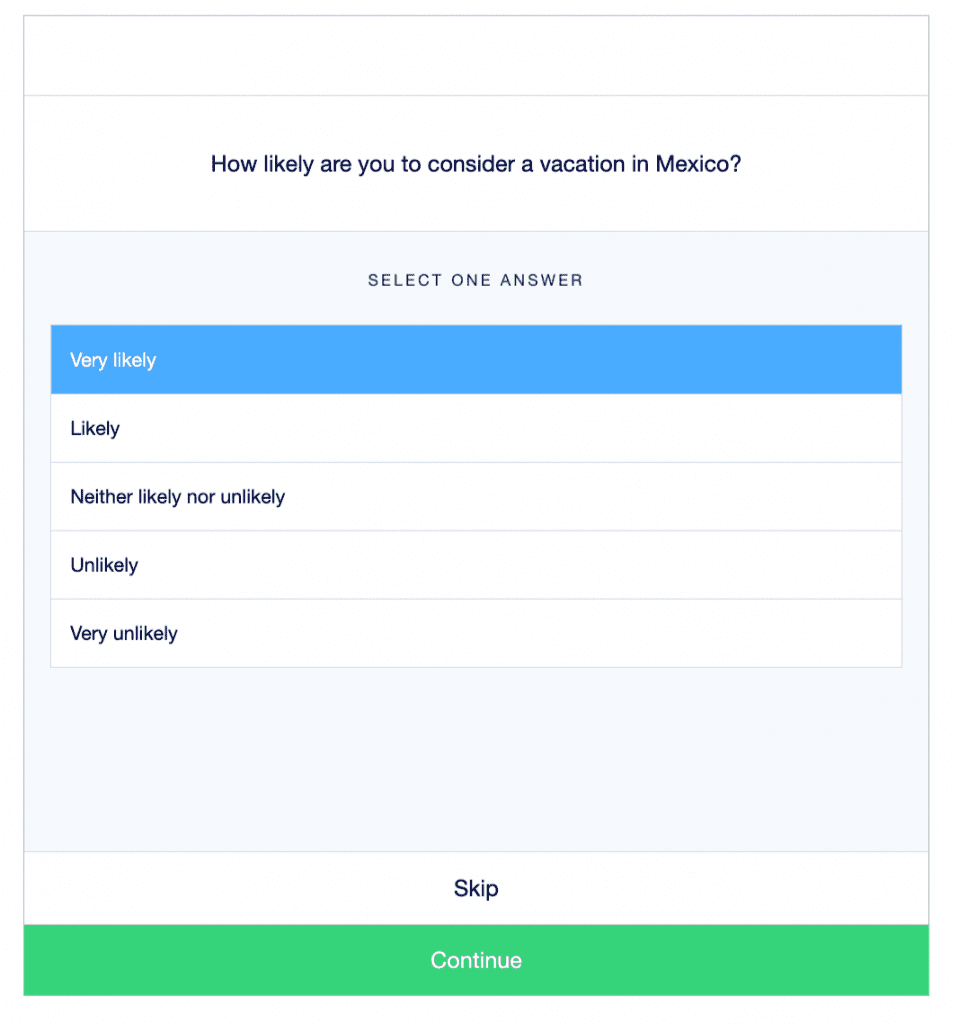 Rating scale questions ask respondents to score something, such as satisfaction, likelihood or quality. This includes formats like Likert scales, which measure agreement with a statement and makes rating scales useful for comparing attitudes and experiences across a group.