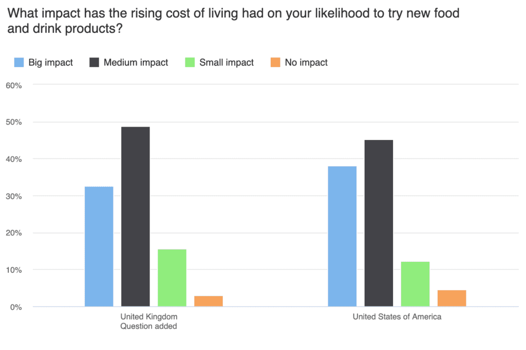 In our recently released US and UK Food & Beverage reports, we found that many shoppers are sticking to a tight budget when they go food shopping. Right now, trying something new is a risk that cash-strapped consumers are probably less likely to want to take. This data certainly seems to back that up, with 83.2% of US Gen Z and 81.4% of UK Gen Z stating that the rising cost of living is having a medium to big impact on their likelihood to try new food and drink products.