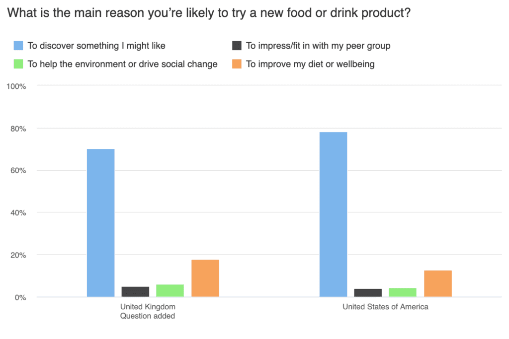 Only 4.0% of Americans and 5.0% of Brits admit that the main reason they would try a new food or drink product is to fit in with or impress their peers. This could be higher in reality but peer pressure simply isn’t stated as a major motivator.