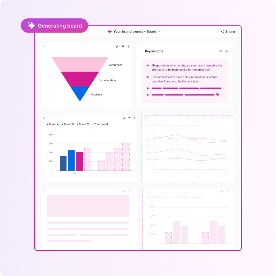 Finally, you have your findings in a Board but need to turn these into insights. Our AI will suggest chart titles and captions to contextualise the findings for your stakeholders. You can then layer on recommendations specific to your business context and get the Board into your stakeholder’s hands.
