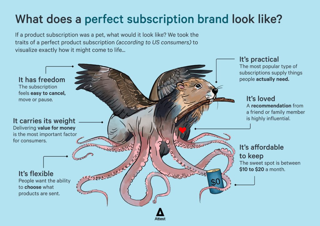 This got us thinking, what would a perfect product subscription actually look like? So we decided to put on our white coats and do our best impression of Dr Frankenstein. We’ve stitched together all the elements that consumers want in a subscription brand (represented by different animals) to create our very own Subscriptionstein’s Monster.