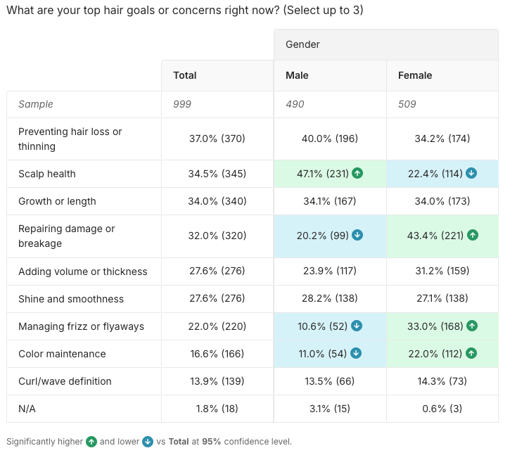 When we look at the gender split, we see males are overwhelmingly concerned about scalp health – 47% said this is a top concern, compared to just 22% of women.