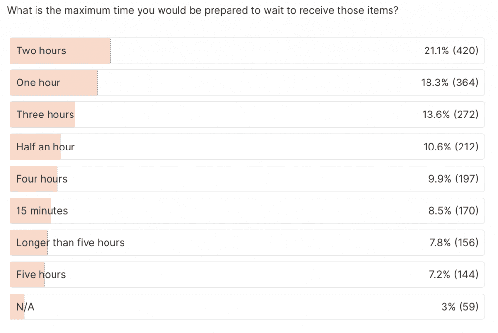 Our data shows that the single largest percentage of people (21%) are willing to wait up to two hours, while 18% will wait an hour. Only 11% expect delivery in half an hour and 8.5% within 15 minutes. The demographic least willing to wait are Gen Z, the single largest percentage of whom (20%) expect delivery in one hour.