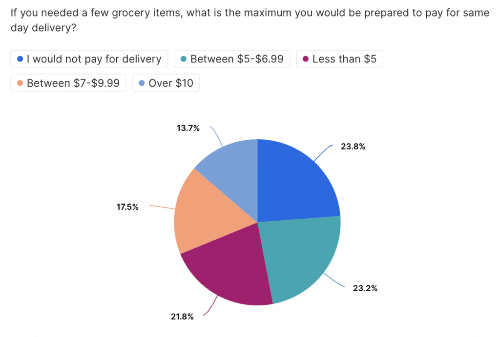 Among Americans who are willing to pay for the delivery of grocery items – that’s 76% of the population – the single largest percentage (23%) expect to pay between $5-$6.99, while 22% expect to pay less than $5.