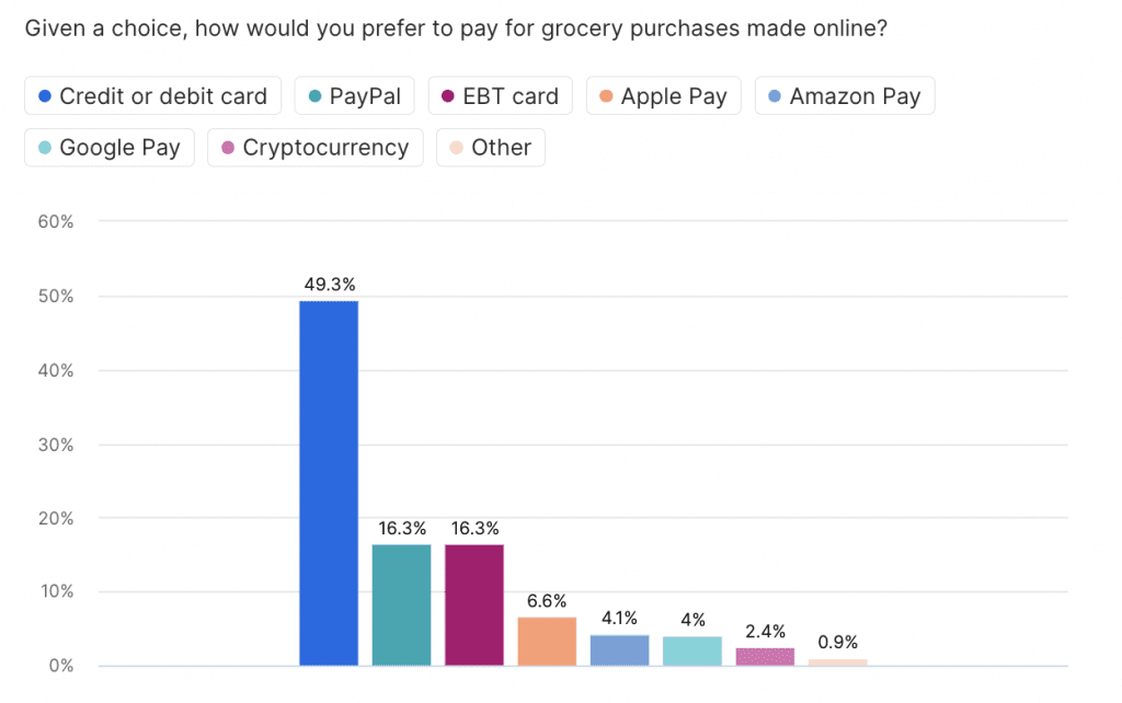 Publix is the latest retailer to join the government’s SNAP Online Purchasing Pilot, alongside Walmart, Aldi and Amazon, to enable their customers to pay by EBT card. In joint second place when it comes to payment preferences is PayPal, selected by 16% of respondents. Meanwhile, eWallet options including Apple Pay and Google Pay are only preferred by 7% and 4%, respectively.