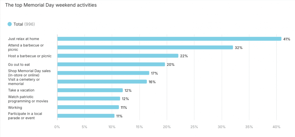 Only 30% of consumers had specific plans for Memorial Day weekend ahead of the event. About the same share (33%) didn’t do anything special at all, while 37% spontaneously decided how to mark the occasion. Men were more likely to have firm plans in place, while women were more likely to not do anything.