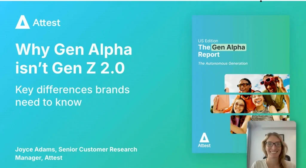 In this lightening-fast 10-minute session, Joyce Adams, Senior Customer Research Manager at Attest, shares exclusive findings from our US Gen Alpha Report and explores how this cohort compares to Gen Z. You’ll learn: ✅ How Gen Alpha’s media habits differ from Gen Z — and why gaming is their new “prime time” ✅ The role AI already plays in their daily lives ✅ Why they’re more pragmatic and financially savvy than previous generations ✅ What brands must do differently to earn their trust and attention Watch on-demand to understand the Autonomous Generation — and how to reach them before your competitors do. Watch now