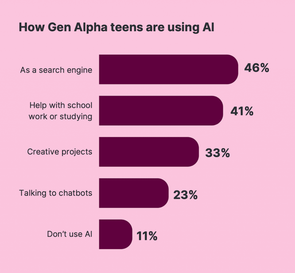 For Gen Alpha, AI isn’t cutting edge, it’s commonplace and embedded in daily life. Nearly half use it for information gathering and school work, while many engage with AI on a personal level. 23% of Gen Alpha teens talk to AI for advice, companionship and emotional support.