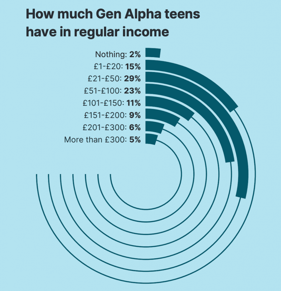 Gen Alpha teens are already financially autonomous and brand-aware, making regular purchases in fast food, digital products, personal care, and apparel. Nearly a third (31%) receive more than £100 a month, and many are earning it themselves, through part-time jobs or side hustles.