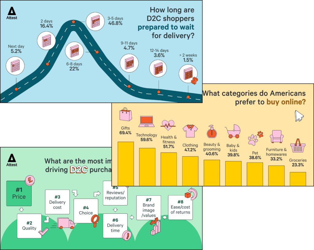 Delivery times and costs are a key battleground for D2C sellers, with everyone competing to do it faster and cheaper. Delivery cost is especially important. Our data shows that delivery cost is the third-most important factor that drives Americans to purchase, behind price and quality.